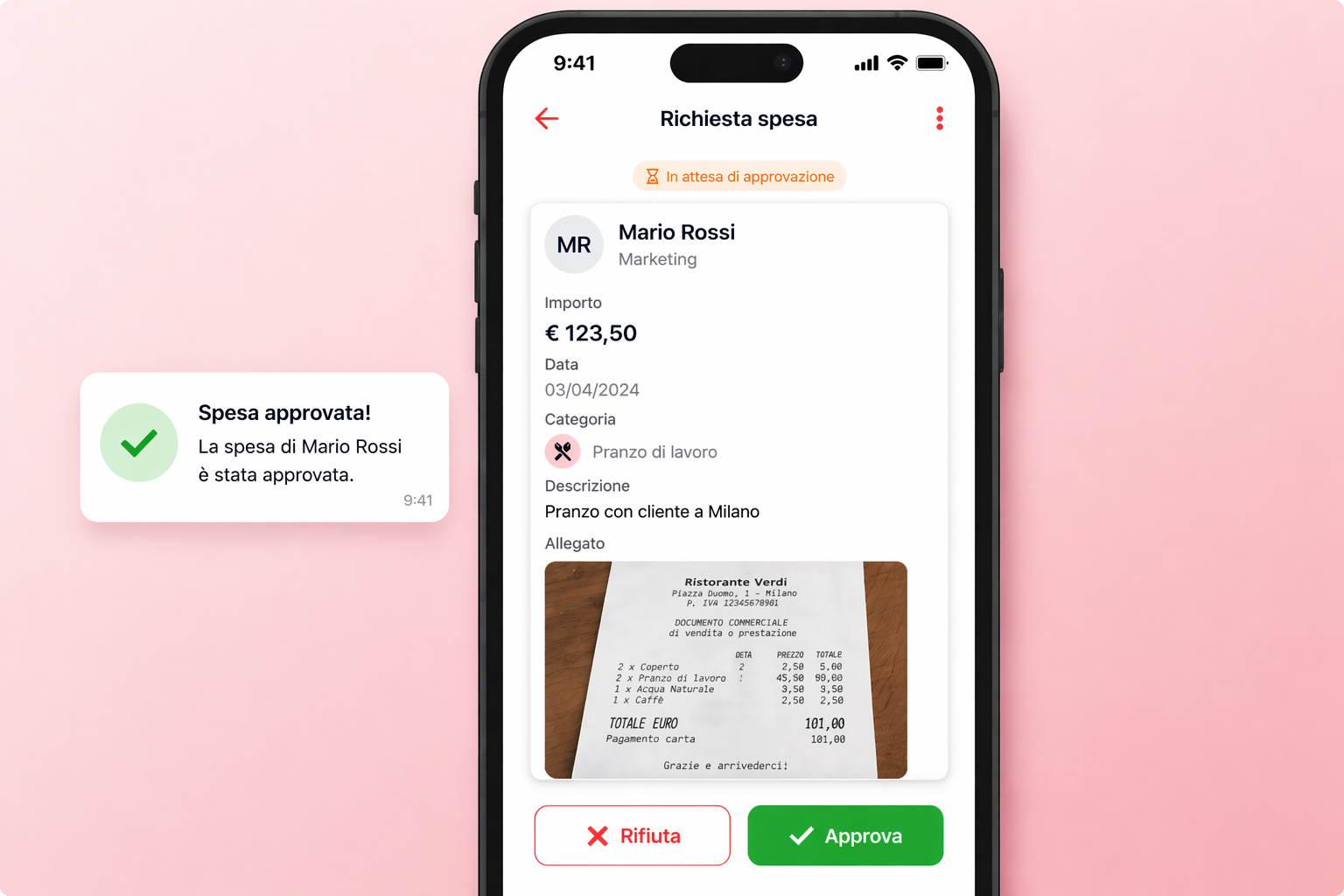 Manager e responsabili possono approvare o rifiutare le spese direttamente in app, senza rallentare i processi.